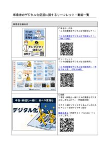 トピックス Topics > HOME > トピックス > (別紙5)事業者のデジタル化促進に関するリーフレット・動画一覧 (別紙5)事業者のデジタル化促進に関するリーフレット・動画一覧 2025年11月12日 一覧へ 次へ 最新の投稿 【介護保険最新情報vol.1493】令和8年10月貸与分から適用される福祉用具の全国平均貸与価格及び貸与価格の上限の公表について(新商品に係る分)(令和8年4月10日) 【介護保険最新情報vol.1492】「介護保険法施行令第 37 条の13 第5項の規定に基づき厚生労働大臣が定める事由第5号の規定に基づき厚生労働省老健局長が定める事由について」及び「令和6年度以降における地域支援事業交付金に係る介護保険法施行令第37 条の 13 第5項の厚生労働大臣が認める額の取扱いについて」の一部改正について(令和8年4月3日) 第44回社会保障審議会介護給付費分科会介護事業経営調査委員会資料について カテゴリー お知らせ 最新情報 情報発信 講演・研修 アドバイザー 事務連絡 統計・調査 分科会 公募情報 年別・月別アーカイブ 2026年 4月 (12) 3月 (29) 2月 (16) 1月 (20) 2025年 12月 (39) 11月 (20) 10月 (24) 9月 (29) 8月 (23) 7月 (29) 6月 (22) 5月 (20) 4月 (32) 3月 (27) 2月 (21) 1月 (22) 2024年 12月 (28) 11月 (26) 10月 (18) 9月 (23) 8月 (27) 7月 (25) 6月 (35) 5月 (13) 4月 (30) 3月 (52) 2月 (17) 1月 (52) 2023年 12月 (34) 11月 (22) 10月 (22) 9月 (23) 8月 (22) 7月 (30) 6月 (13) 5月 (17) 4月 (17) 3月 (15) 2月 (15) 1月 (9) 2022年 12月 (25) 11月 (14) 10月 (16) 9月 (22) 8月 (19) 7月 (15) 6月 (17) 5月 (11) 4月 (25) 3月 (30) 2月 (17) 1月 (13) 2021年 12月 (21) 11月 (25) 10月 (13) 9月 (19) 8月 (15) 7月 (12) 6月 (23) 5月 (12) 4月 (8) 3月 (9) 2月 (5) 1月 (9) 2020年 12月 (9) 11月 (3) 10月 (1) 4月 (1) 2019年 12月 (1) 11月 (2) 一覧へ 次へ